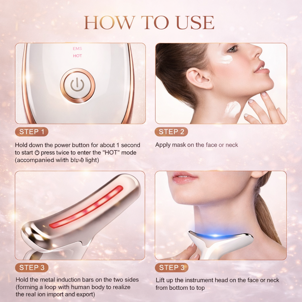 It helps lift and tighten the skin, reduce fine lines and wrinkles, stimulate collagen production, and improve overall skin tone and elasticity using EMS microcurrents, heat, cooling, and LED light therapy.